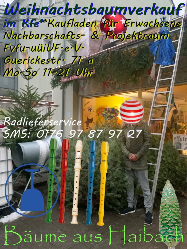 Täglich beim Vorgartenamt im Nachbarschaftsprojektraum KfE*, „Kaufladen für Erwachsene “, Guerickestraße 71 a: Regionale ungespritzte Weihnachtsbäume. Der Fvfu-uüiUF.e.V. – Kunstverein will nach einem weiteren Jahr täglicher unentgeltlicher Arbeit wieder aus dem Minus ins Plus zu kommen und die Guerickestraße weiter aufforsten. Lieferung wie immer schon mit dem Fahrradanhänger. Kontakt: Jakob Friedl 0176 97 87 97 27