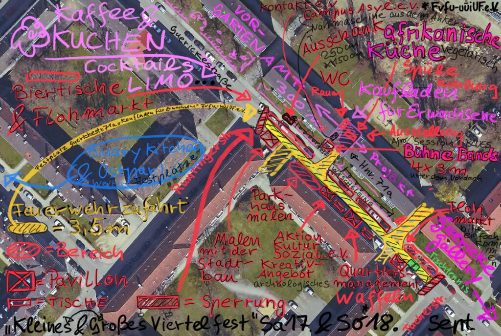 […] Der Nachbarschafts- & Projektraum KfE*„Kaufladen für Erwachsene im Vorgartenamt“ des Fvfu-uüiUF.e.V. – Kunstvereins beackert seit Anfang 2022 im Entwicklungsgebiet sozialer Zusammenhaltauf dem Territorium der Stadtbau Neuland und steht allen Interessierten und Gruppen täglich rund um die Uhr kostenfrei zur Verfügung: Küche, Bar, Bühne, Werkstatt, Atelier, 300m breites Vorgartenamt, Foodsharingverteiler. Kaufladen und Vorgartenamt sind formbare Orte, die der Erfahrungsproduktion dienen und sich langfristig kontinuierlich weiterentwickeln, vernetzen und Bestand haben sollen. Seit Februar 2022 wird der Unterhalt des Straßenbegleitgrüns der Bestandsgebäude Guerickestr. Nr. 53 -75 nicht mehr an einen rasenmähenden Hausmeisterservice vergeben, sondern vom FUF-Kunstverein übernommen, der die Grünflächen in unentgeltlicher Arbeit hinsichtlich der Aufenthaltsqualität, der Artenvielfalt, des Stadtklimas und der Versickerung von Niederschlagswasser qualifizieren und gestaltbar machen will.