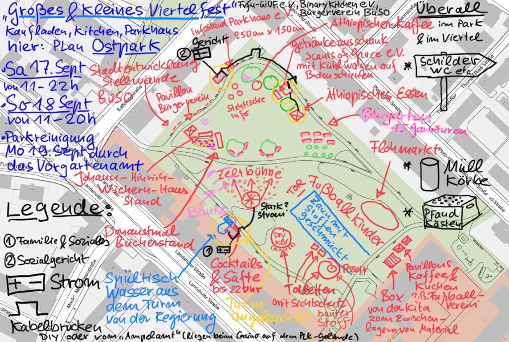 Am Samstag, den 2. August 2025, feiern wir wieder Musik, Kunst und DIY-Kultur auf einer selbstgezimmerten Bühne vor der ehemaligen Gartenamtsunterkunft im neu gestalteten Ostpark, in dem der Gemeinschaftsort Parkhaus leider immer noch fehlt. Der gemeinnützige Parkhaus e.V. ist seit 4 Jahren baubereit und wartet geduldig darauf endlich mit der partizipativen Kulturbaustelle beginnen zu können. Konsequent im Sinne der Förderkulisse des Integrierten städtebaulichen Entwicklungskonzepts (ISEK) gedacht, hätte das kostengünstige Bau-Projekt eigentlich am Anfang der Parkumgestaltung stehen müssen – ganz im Sinne des sozialen Zusammenhalts. Stattdessen hat der Parkhaus e.V. bis heute noch nicht einmal einen Zwischennutzungsvertrag. Wir lassen uns jedoch nicht entmutigen und feiern gemeinsam mit Euch unsere Idee.