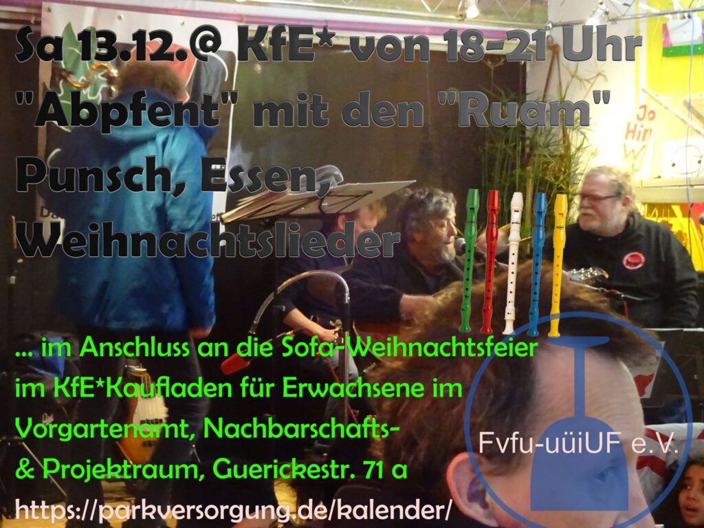 Kommt, trinkt einen marokkanischen Rosenblütentee mit Süßholz und lasst Euch einen Soli-Baum vom Dach schmeißen… Damit der gemeinnützige und aus Prinzip unentgeltlich tätige Fvfu-uüiUF e.V- Kunstverein mit dem KfE* zum Jahresende ohne Schulden da steht. Hallo: 0176 97 87 97 27