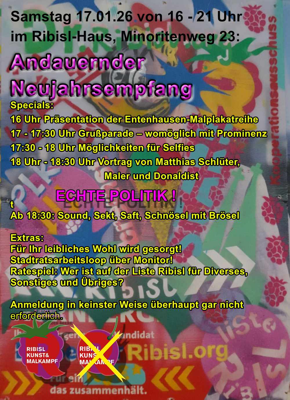 Sa 17.1. von 16-21 Uhr im Ribisl-Haus: Andauerner Neujahrsempfang der Ribisl-Partiee.V. mit Präsentation der Entenhausen Plakatreihe und einem Vortrag über Donaldismus von Matthias Schlüter & Jazzband.