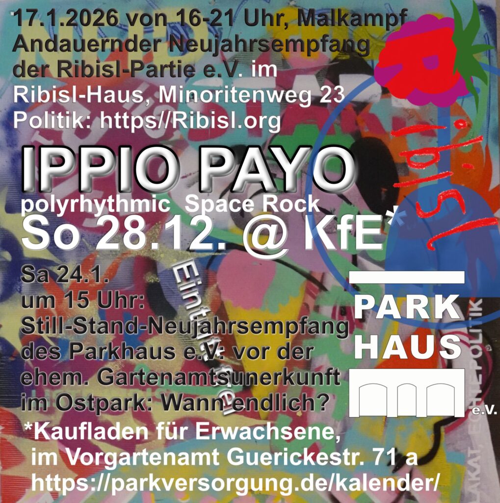 Sa 10.1.2025 von 15 bis 21 Uhr im KfE*: II. Permanenter Neujahrsempfang des Fvfu-uüiUF e.V.-Kulturvereins mit Uli Teichmanns funkipunki-Loops und den Tranquilized Housewives (Krautrock) – Eintritt immer frei