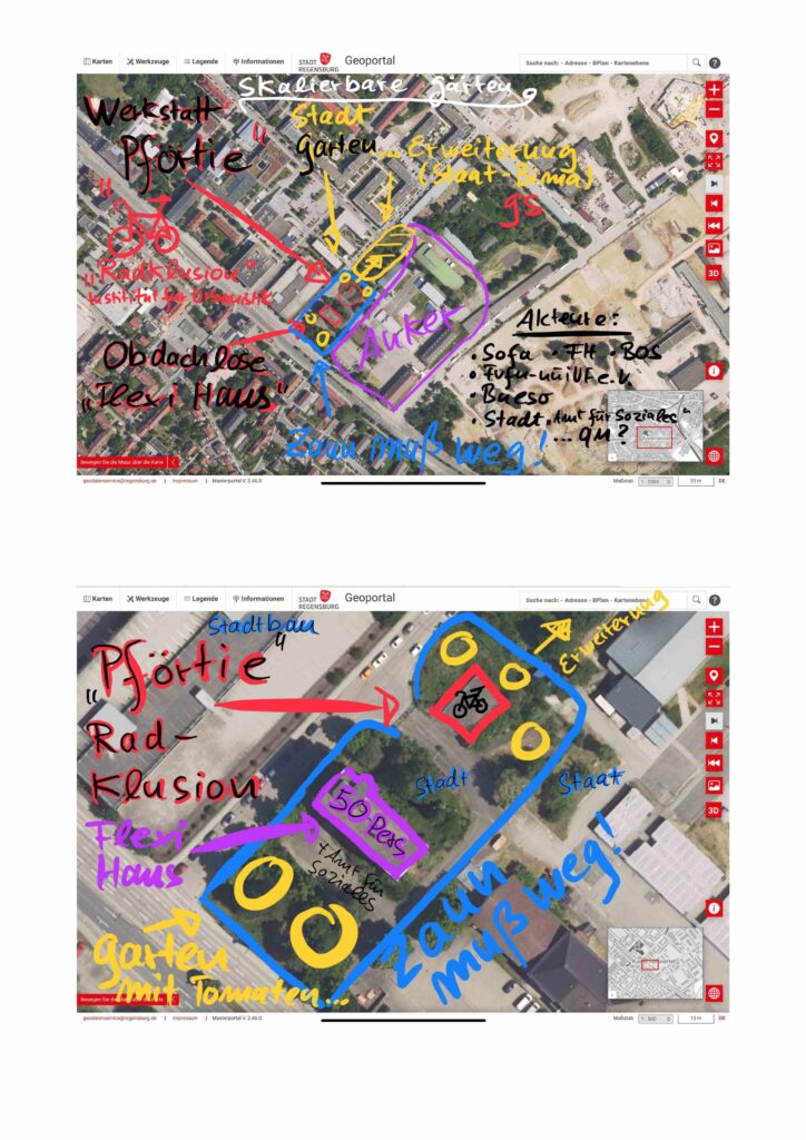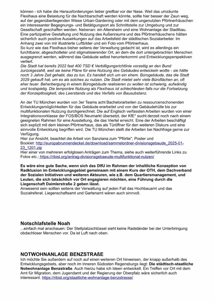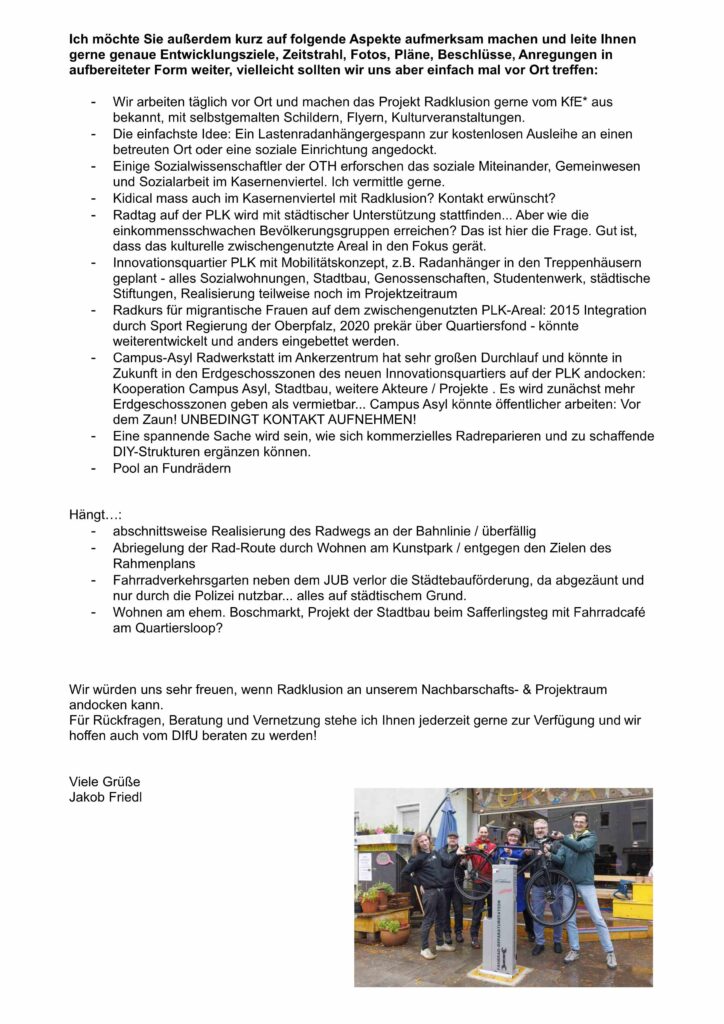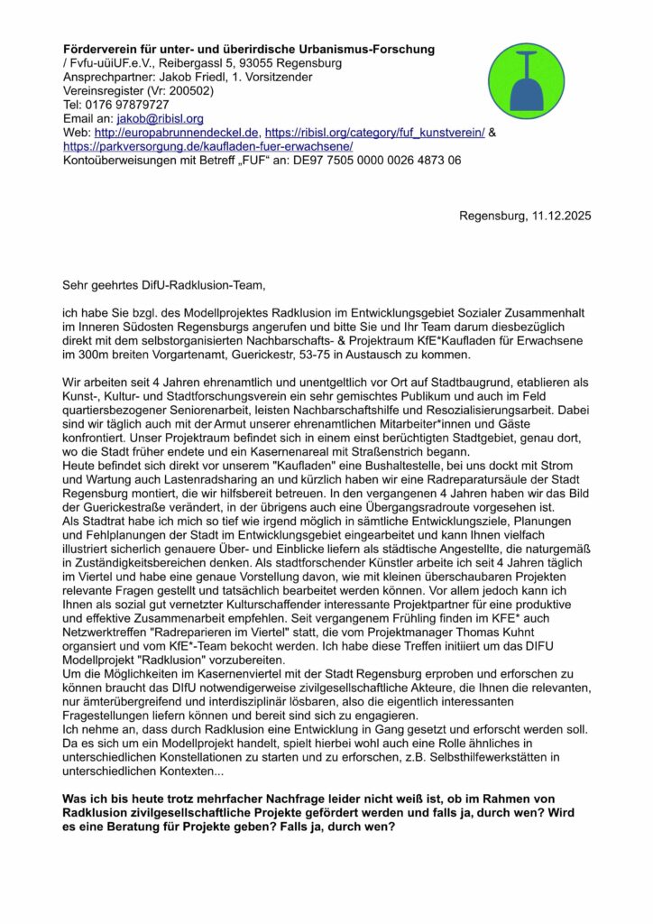 Der Nachbarschafts- und Projektraum KfE* will Experimentierfeld und Forschungsgegenstand für Radklusion werden! Der Fvfu-uüiUF.e.V. hat dem DIfU zum Einstand einen Brief mit ein paar Anregungen geschickt, u.a. auch zum Thema Obdachlosenunterbringung im „Flexihaus“, dem ehemaligen Divisionsgebäude in der Daimlerstr. 4, wo im Pförtnerhaus ein Begegnungsraum mit Radwerkstatt entstehen könnte: